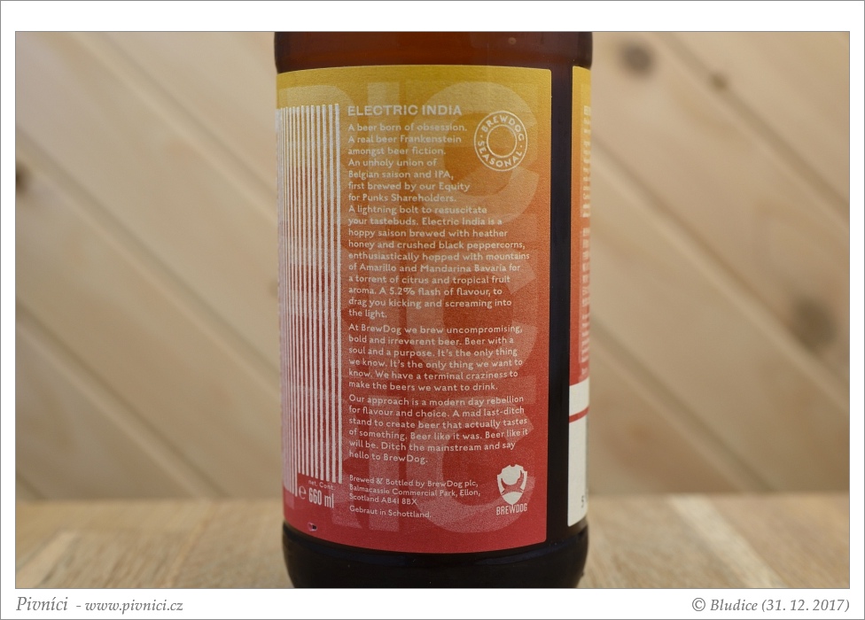 Zlatá barva, téměř čiré. Pěkná světlá pěna, velmi dobře drží.Vůně (3,5 - velmi dobré):