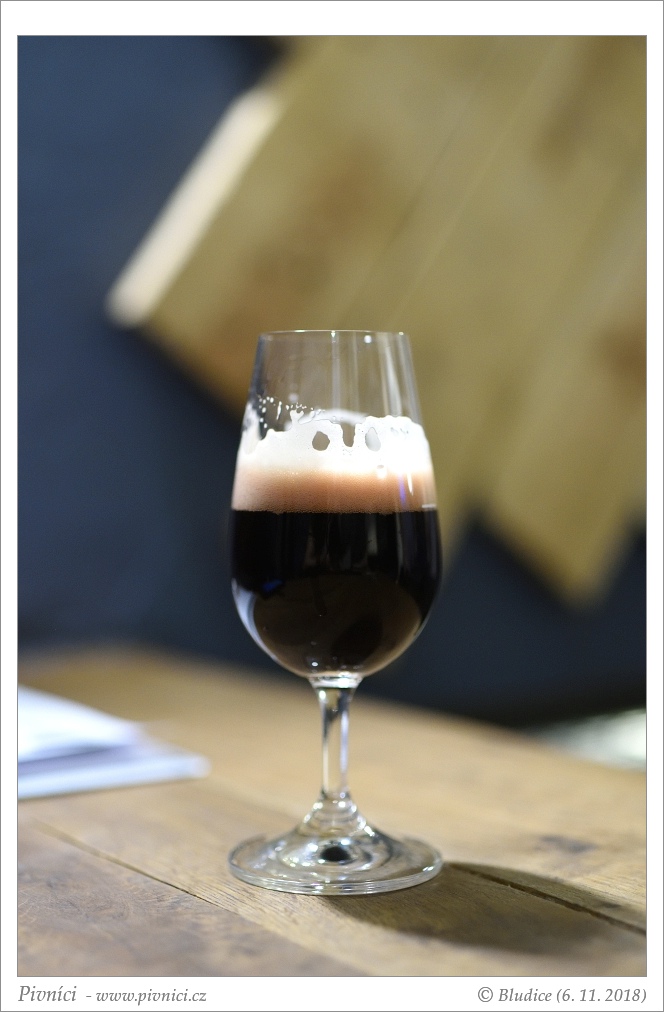 Barva velmi tmavě mahagonová, lehce do rubínova. Pěkná hustá stabilní pěna světle béžové barvy s růžovým nádechem.Vůně (3 - dobré):