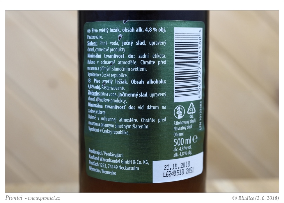 Vcelku slušně chmelené pivo, ale bohužel docela máslové, takže se pije jen průměrně dobře.Minimální trvanlivost: 21. října 2018