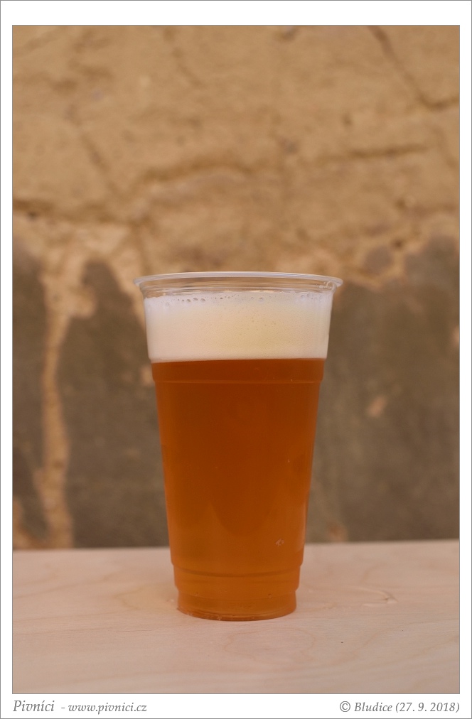 Zlatá barva, lehce zakalené. Pěkná světlá pěna, dobře drží.Vůně (3,5 - velmi dobré):