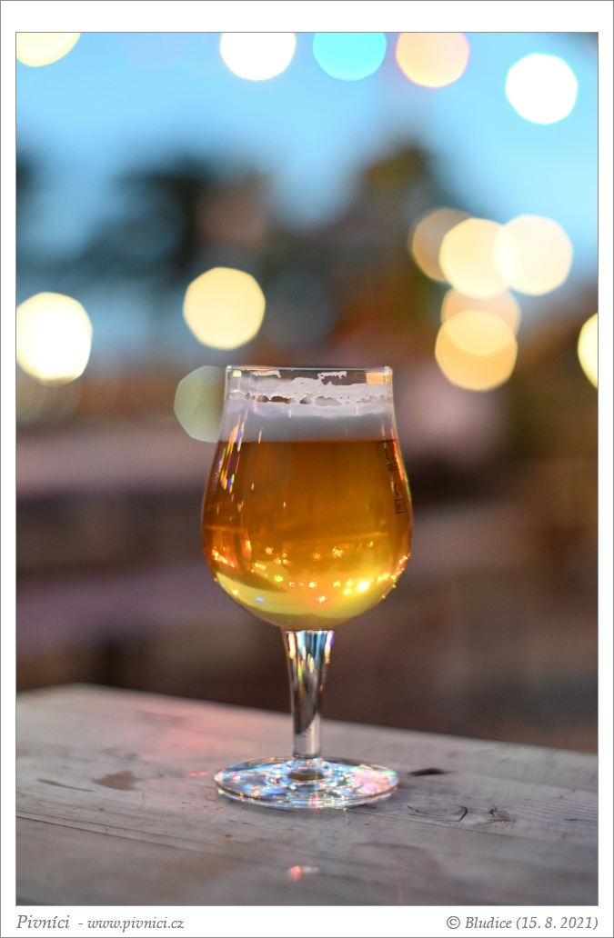 Zlatá barva, téměř čiré. Pěkná světlá pěna, dobře drží, hezky kroužkuje.Vůně (3 - dobré):