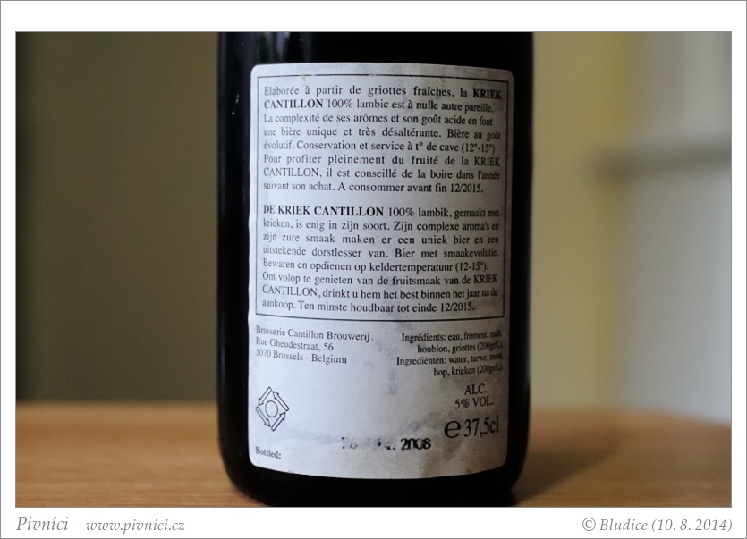 Opravdu výrazně kyselý Kriek. Zpočátku to byl trochu šok, ale když si člověk zvykne, je velmi chutný a zajímavý. Příště bych si ho ale radši dala čerstvější.Lahvováno: 16. dubna 2008