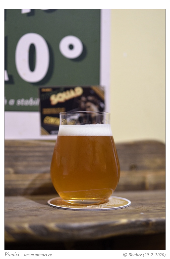 Zlatá barva, velmi lehce zakalené. Nízká světlá pěna, slušně drží.Vůně (3,5 - velmi dobré):