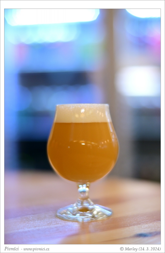 Zlatá až lehce oranžová barva, výrazně zakalené. Slušná světlá pěna, ale tolik nedrží (kvůli množství infuzovaného ovoce).Vůně (4 - výborné):