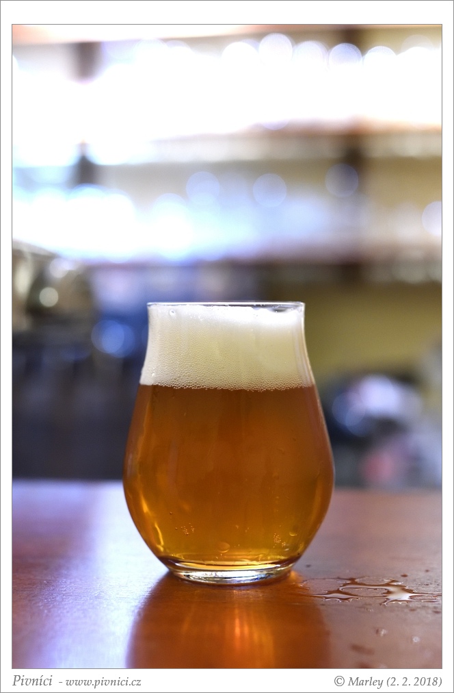 Zlatá barva, lehce zakalené, pěkná světlá pěna, dobře drží.Vůně (3 - dobré):