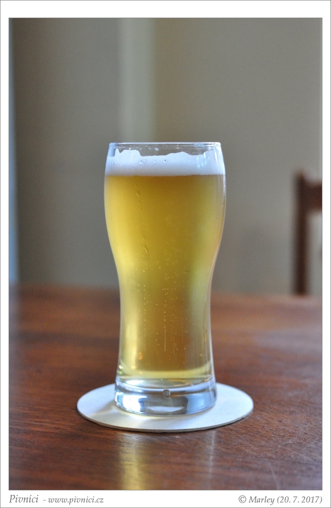 Světle zlatá barva, čiré, pěkná světlá pěna, dobře drží.Vůně (2,5 - lehce nadprůměr):