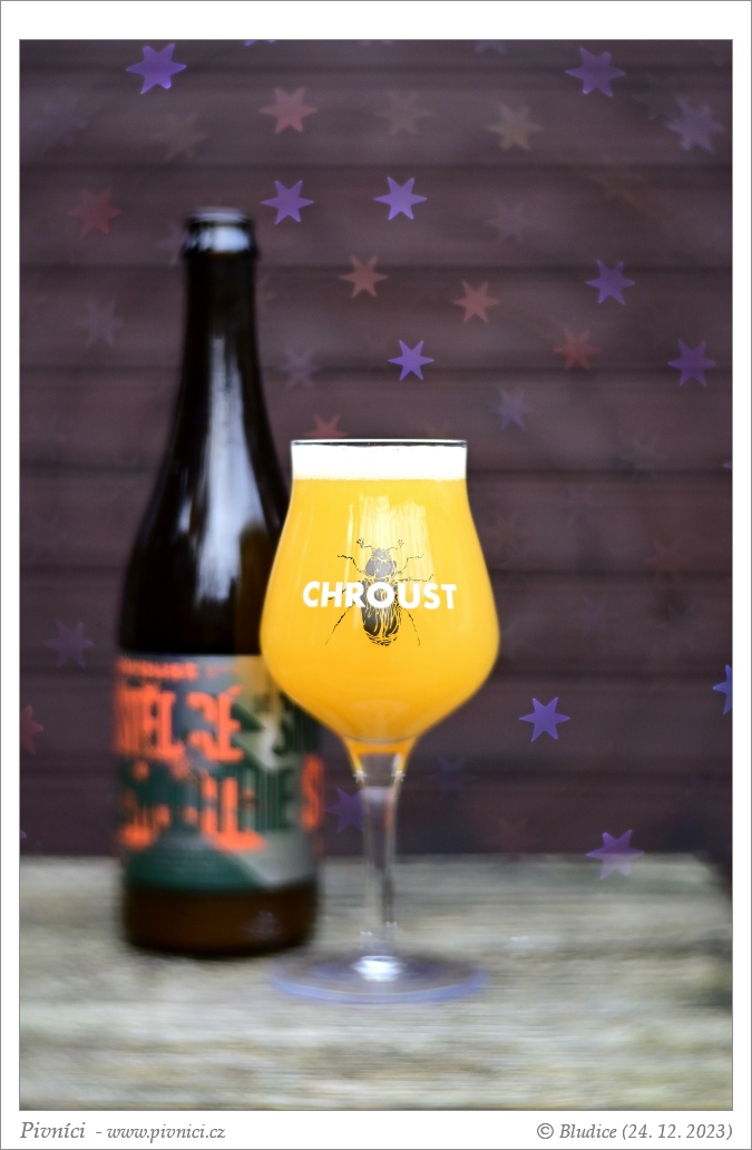 Zlatá barva s oranžovým nádechem, velmi zakalené. Slušná světlá pěna, celkem drží.Vůně (3,5 - velmi dobré):