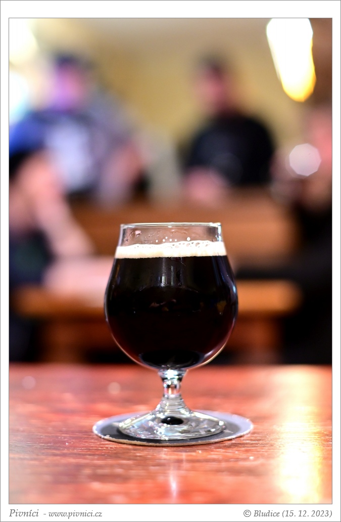 Ebenová barva, téměř čiré. Pěkná světle béžová pěna, celkem drží.Vůně (3,5 - velmi dobré):