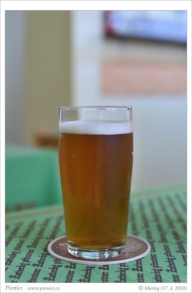Tmavě zlatá barva, velmi lehce zakalené. Slušná světlá pěna, celkem drží.Vůně (1,5 - nedobré):