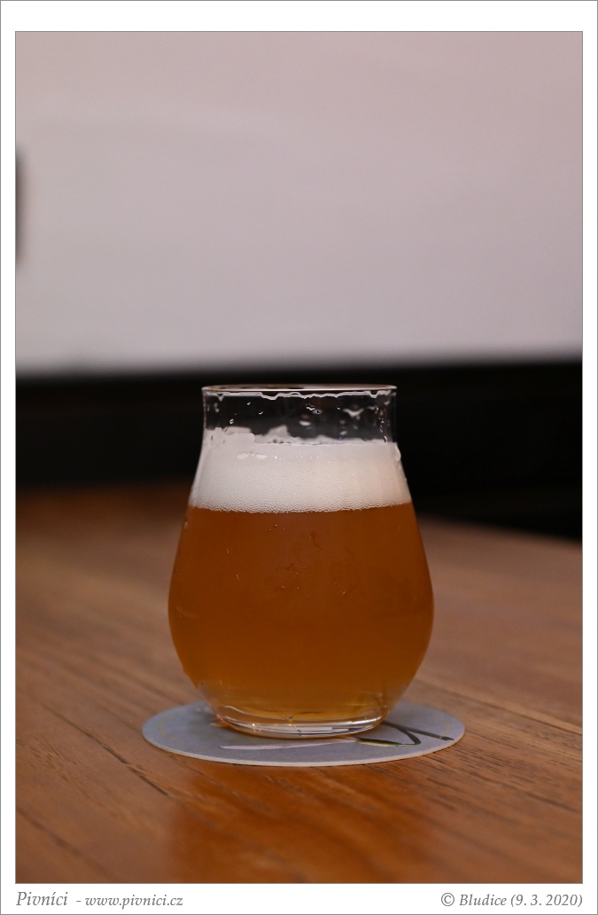 Zlatá barva, velmi lehce zakalené, pěkná bílá pěna, dobře drží.Vůně (3,5 - velmi dobré):