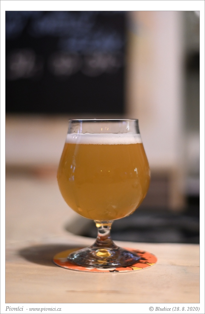 Světle zlatá barva, lehce zakalené. Pěkná světlá pěna, dobře drží.Vůně (3,5 - velmi dobré):