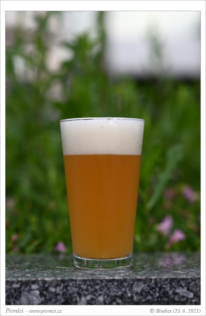 Zlatá barva, středně zakalené. Pěkná světlá pěna, dobře drží, hezky kroužkuje.Vůně (3,5 - velmi dobré):