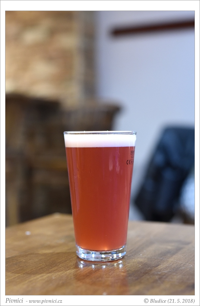Barva tmavší růžovo-oranžová, silně zakalené. Pěkná hustá poměrně stabilní pěna s lehce narůžovělým nádechem.Vůně (3 - dobré):