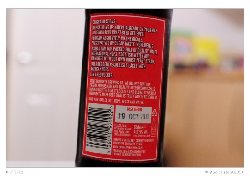 Barva mahagonová, čiré. Pěkná hustá stabilní pěna, která kroužkuje.Vůně (3,5 - velmi dobré):