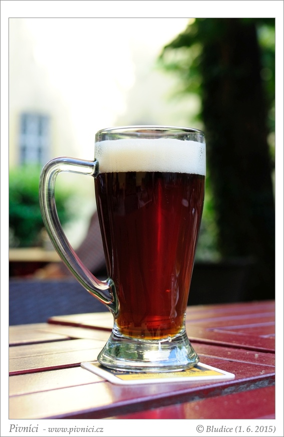 Tmavě měděná až mahagonová barva, středně zakalené, pěkná světle okrová pěna, dobře drží, lehce kroužkuje.Vůně (3,5 - velmi dobré):