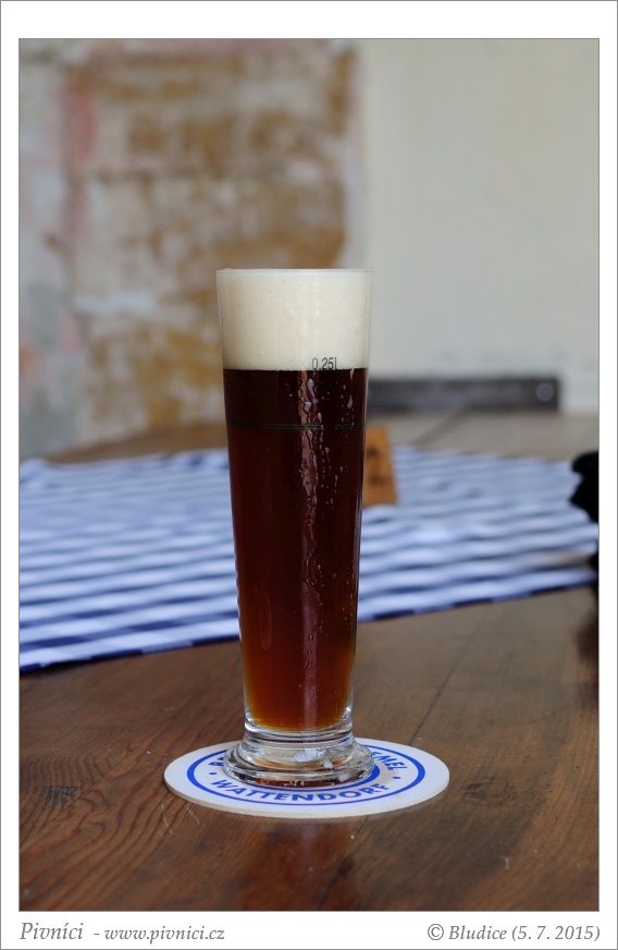 Barva tmavě zlatá, zakalené. Pěkná hustá stabilní pěna. Kroužkuje.Vůně (3 - dobré):