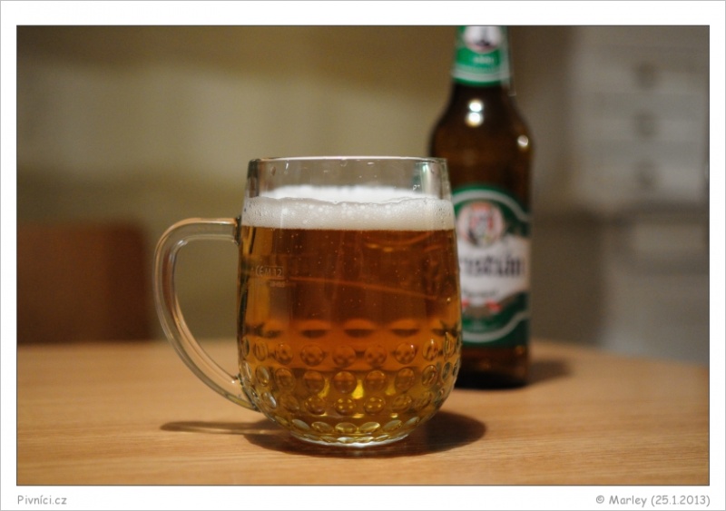 Zlatá barva, čiré, nižší světlá pěna, brzy mizí.Vůně (3,5 - velmi dobré):