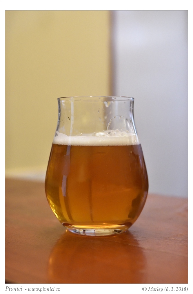 Temně zlatá až měděná barva, téměř čiré. Pěkná světlá pěna, dobře drží.Vůně (2,5 - lehce nadprůměr):