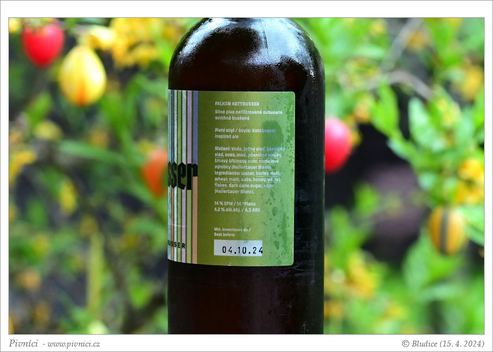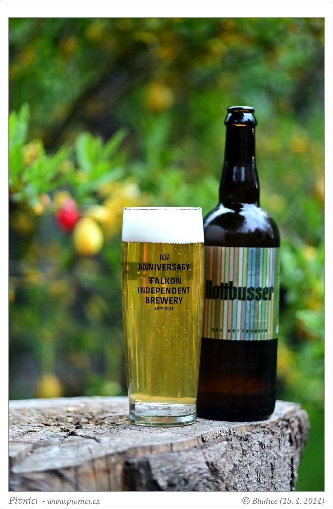 Světle zlatá barva, téměř čiré. Pěkná světlá pěna, dobře drží.Vůně (3,5 - velmi dobré):