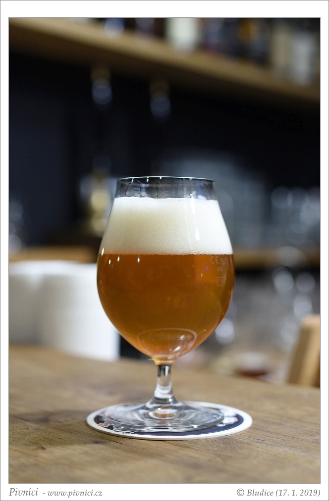 Tmavší zlatá barva, velmi lehce zakalené. Pěkná vyšší světlá pěna, velmi dobře drží, hezky kroužkuje.Vůně (3,5 - velmi dobré):