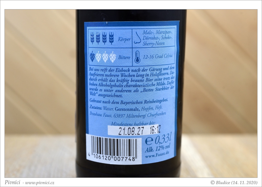 Nižší jemný říz, vyšší plnost. V chuti sladší, sladové, lehce karamelové, s tóny lesního medu, javorového sirupu, vyšší hořkostí a bylinně a lehce kořenitě chmelovými tóny, tóny rozinek a lehce alkoholu. Doznívání je sladší, s tóny lesního medu, toustové, jemně bylinné, s tóny sušených švestek, nádechem sherry a alkoholovou linkou. Alkoholová hřejivost na závěr.Celkový dojem (7,5 - velmi dobré):