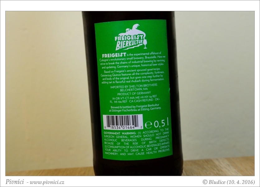 Drsnější Gose, méně kyselé, výrazněji kořeněné i hořké. Dobře se pije.Vzhled (3,5 - velmi dobré):