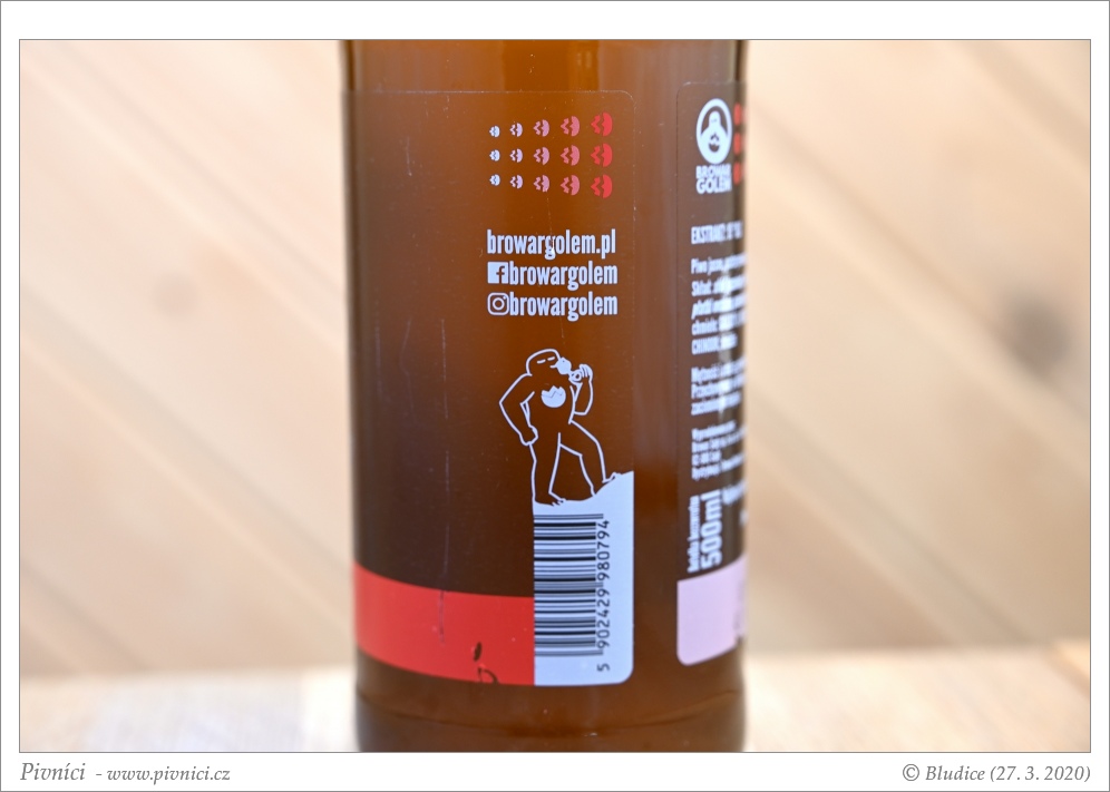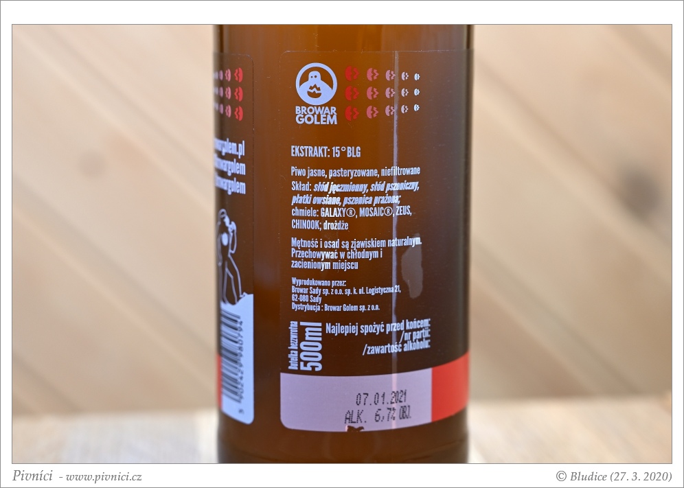 Zlatá barva, velmi lehce zakalené (dva týdny odpočívalo v klidu lednice). Pěkná světlá pěna, slušně drží.Vůně (3,5 - velmi dobré):