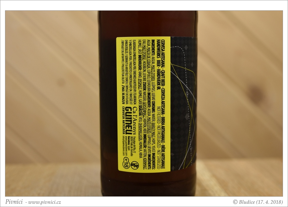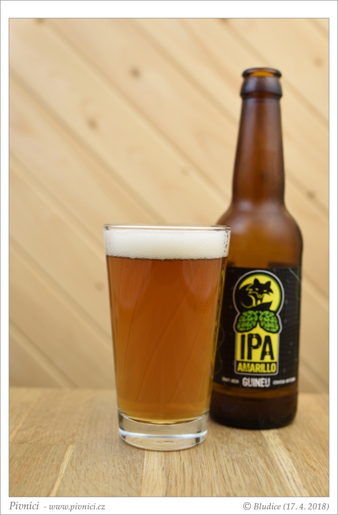Zlatá barva, téměř čiré. Pěkná světlá pěna, velmi dobře drží.Vůně (3,5 - velmi dobré):