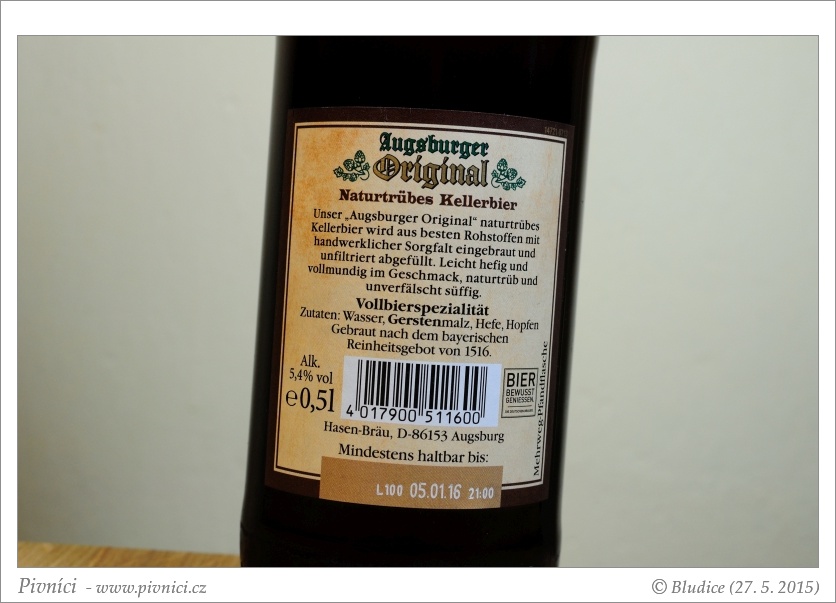 Slámová barva, středně zakalené, pěkná bílá pěna, slušně drží.Vůně (3,5 - velmi dobré):