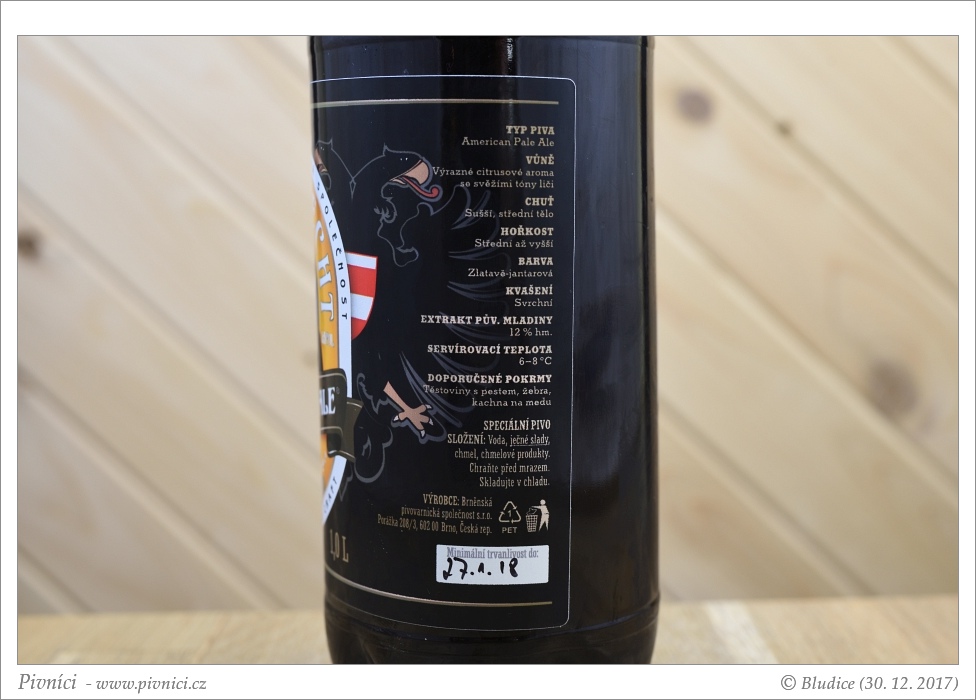 Pokud si někdo objedná APA a dostane tohle, tak se asi docela vyděsí, není to žádná svěží ovocná líbivka. Chutná spíše jako více nachmelený ležák, je lehce osobitý, pije se ale dobře.Minimální trvanlivost: 26. května 2017