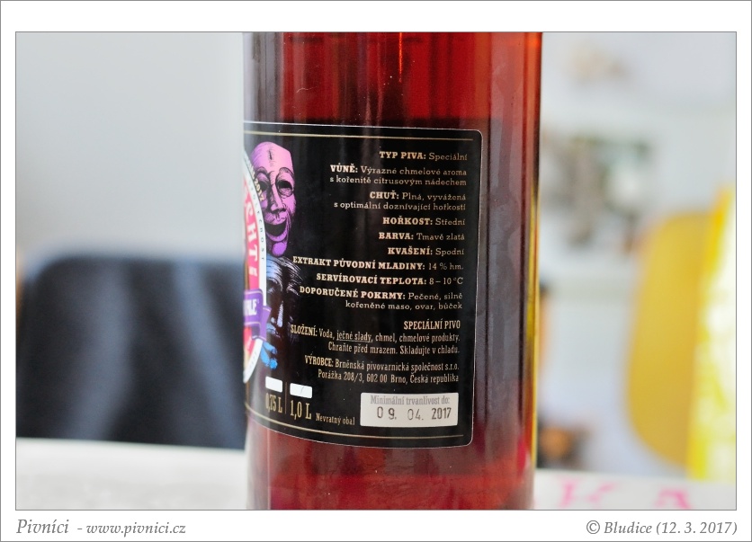 Okej pivo s trochu ostřejší hořkostí. Dobře se pije.Minimální trvanlivost: 9. dubna 2017