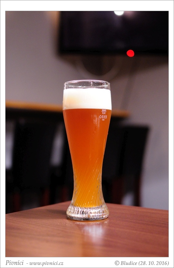 Tmavší zlatá barva, více zakalené, pěkná světlá pěna, dobře drží.Vůně (2,5 - lehce nadprůměr):