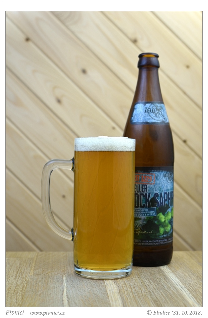 Zlatá barva, lehce zakalené. Pěkná světlá pěna, dobře drží.Vůně (4 - výborné):