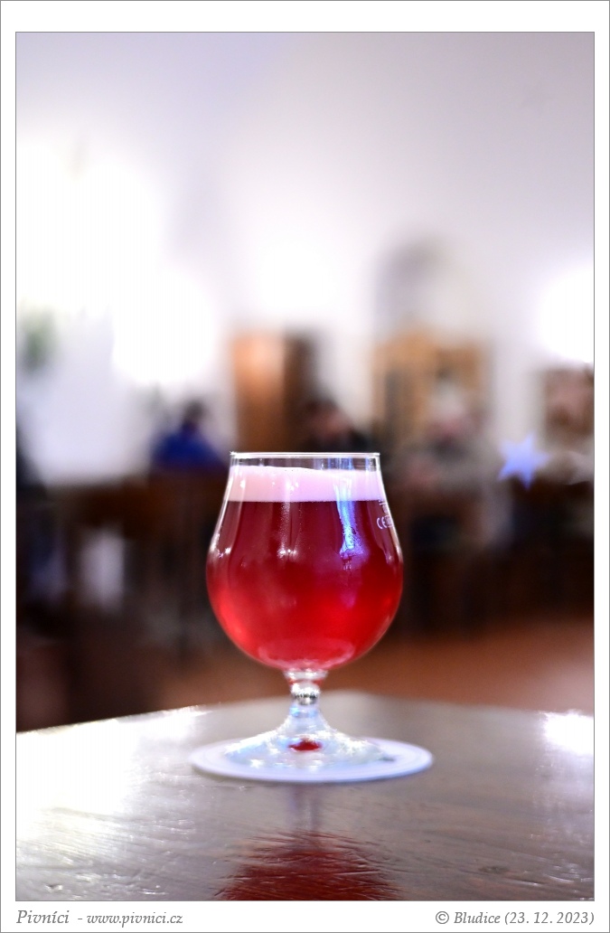 Rubínová barva, středně zakalené. Pěkná světle růžová pěna, dobře drží.Vůně (3 - dobré):