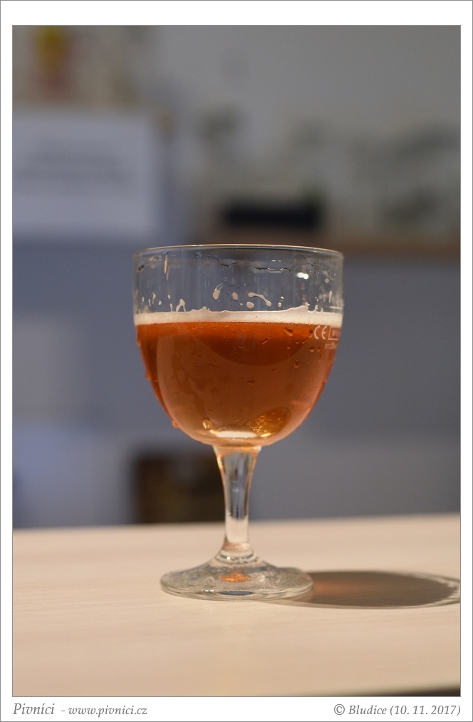 Měděná barva, čiré, nižší světlá pěna, slušně drží.Vůně (3 - dobré):