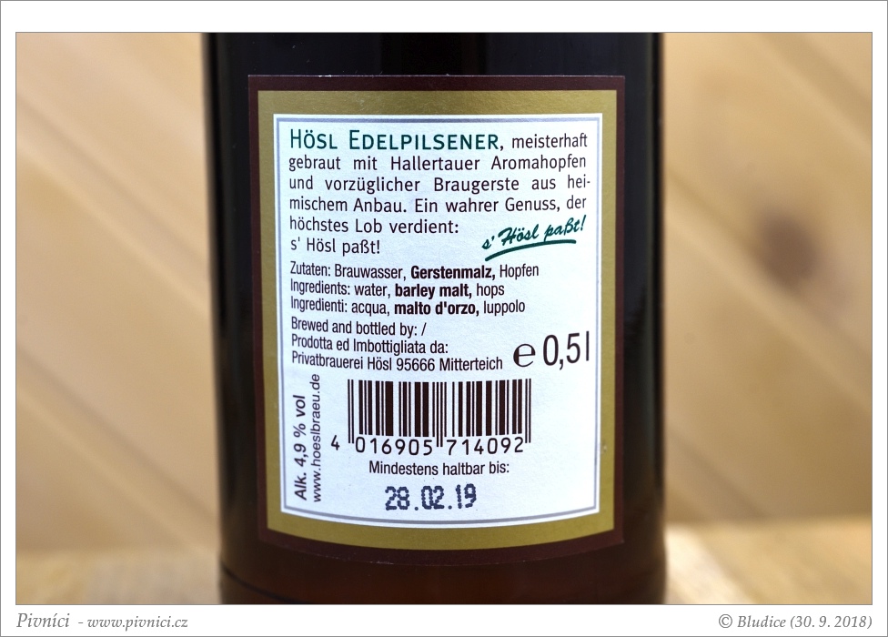 Zlatá barva, čiré. Slušná světlá pěna, dobře drží.Vůně (3 - dobré):