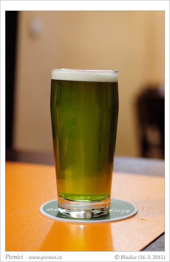 Světle zelená barva s žlutým nádechem, lehce zakalené, nízká světlá pěna, moc nedrží.Vůně (1,5 - nedobré):