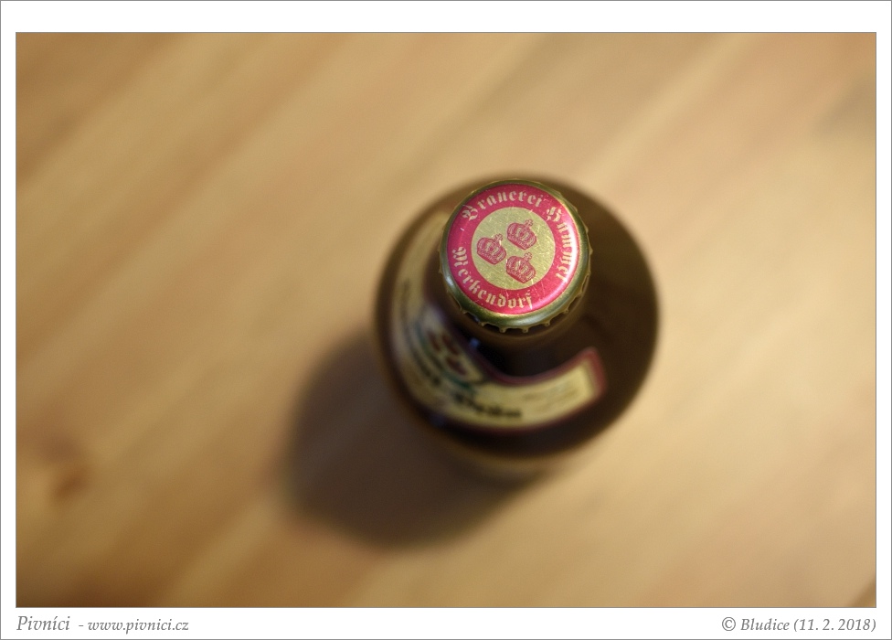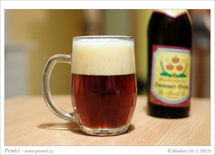 Mahagonová barva, téměř čiré. Pěkná světlá pěna, dobře drží.Vůně (2 - průměr):