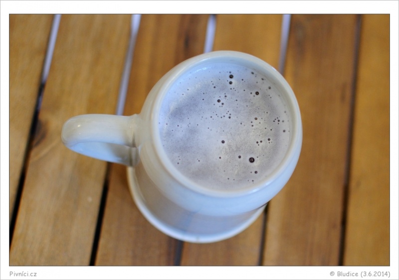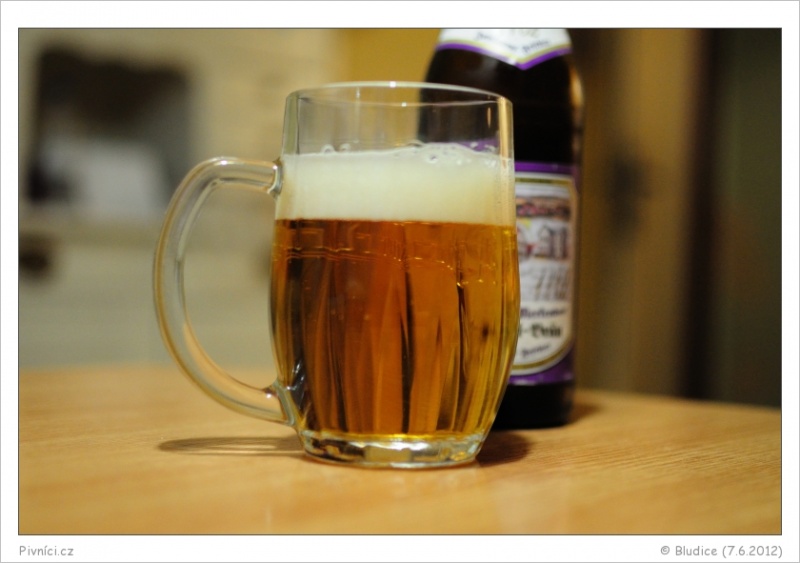 Zřejmě zlatá barva, čiré, průměrná světlá pěna, celkem drží.Vůně (4 - výborné):