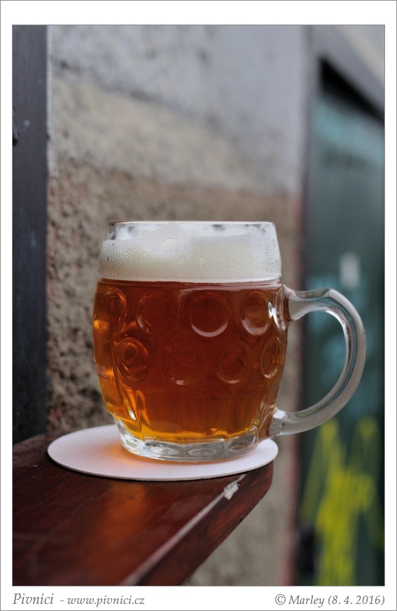 Zlatá barva, téměř čiré, pěkná světlá pěna, průměrně drží.Vůně (2,5 - lehce nadprůměr):