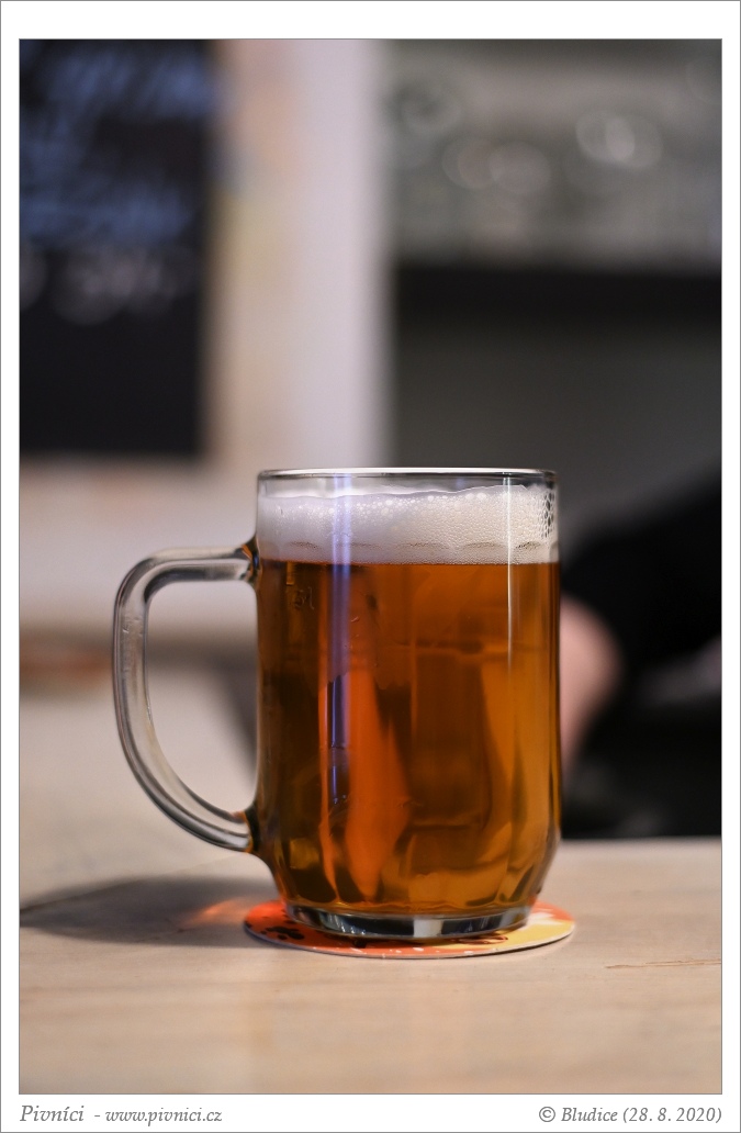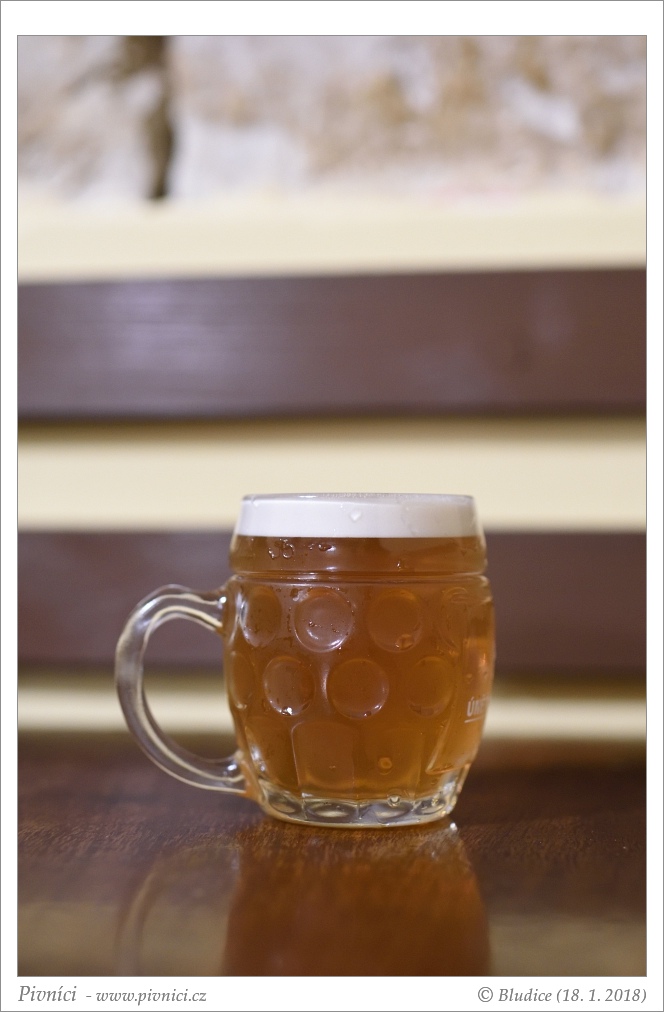 Zlatá barva, téměř čiré. Pěkná světlá pěna, dobře drží.Vůně (3,5 - velmi dobré):