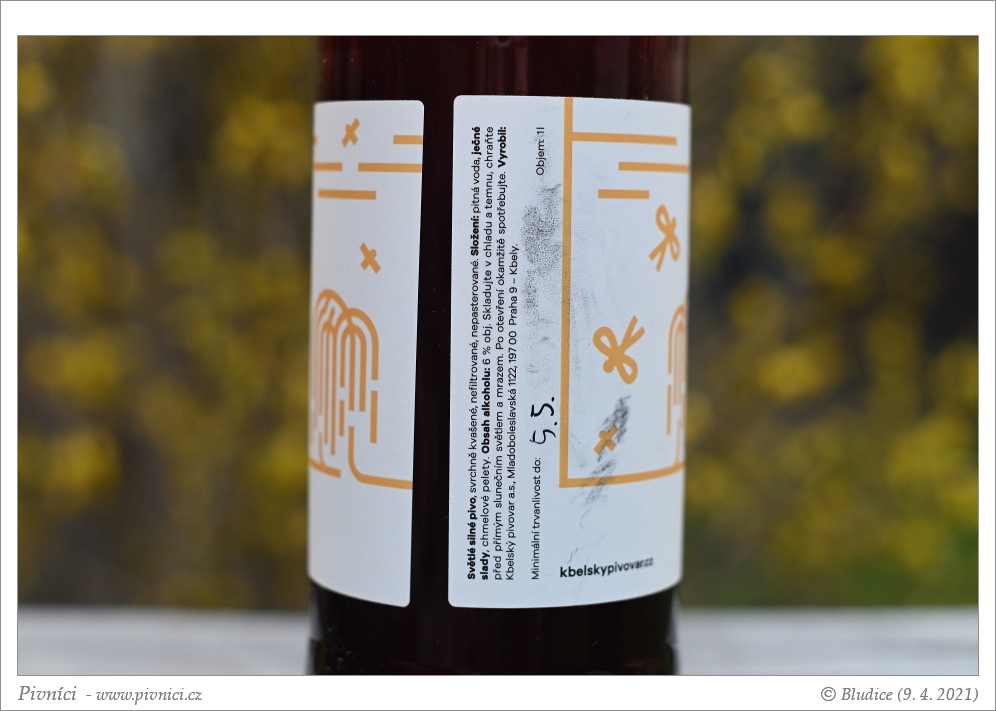 Tmavší zlatá barva, téměř čiré. Slušná světlá pěna, celkem drží.Vůně (2,5 - lehce nadprůměr):