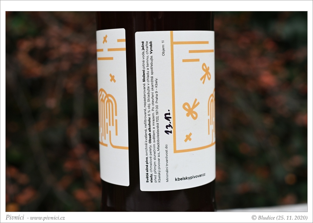 Zlatá barva, velmi lehce zakalené. Pěkná světlá pěna, dobře drží.Vůně (3 - dobré):