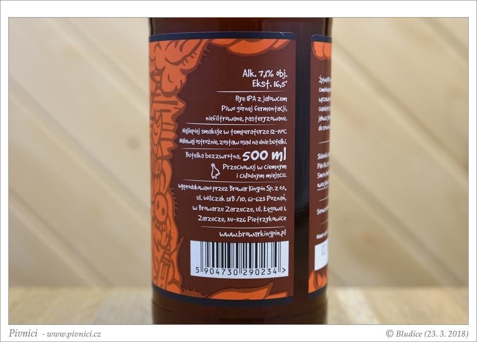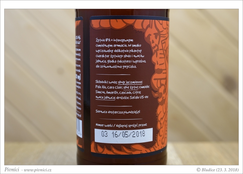 Zajímavé pivo s jalovcovými tóny, ale mohlo by mít příjemnější hořkost.Minimální trvanlivost: 16. května 2018
