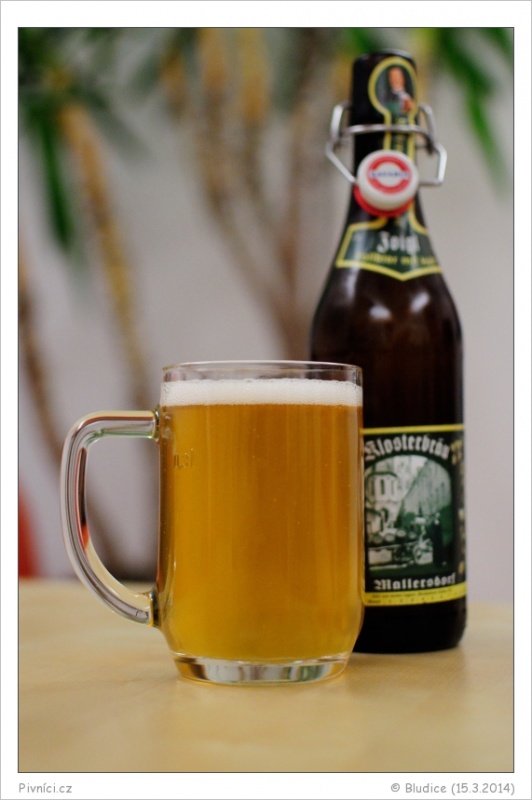 Slámová barva, středně zakalené, průměrná bílá pěna, moc nedrží.Vůně (3,5 - velmi dobré):