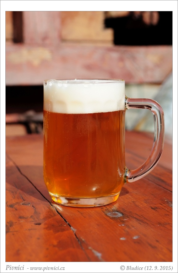 Zlatá barva, velmi lehce zakalené, pěkná bílá pěna, dobře drží, hezky kroužkuje.Vůně (2,5 - lehce nadprůměr):