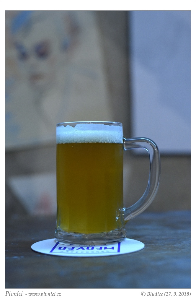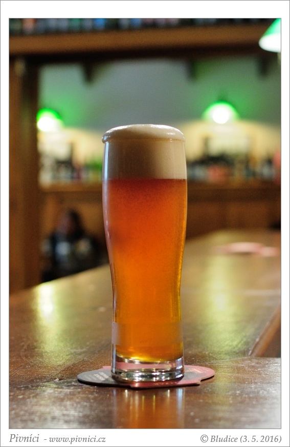 Zlatá barva, lehce zakalené. Pěkná světlá pěna, dobře drží.Vůně (3,5 - velmi dobré):
