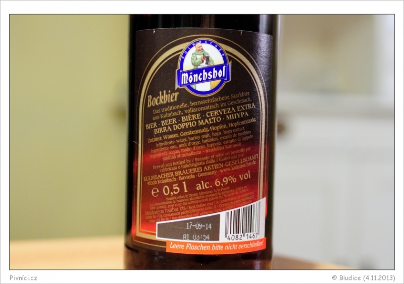 Vydařený a chutný bock. Trochu alkoholovější, ale s pěkným dlouhým dozníváním.Minimální trvanlivost: 17.9.2014