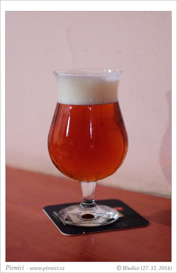 Měděná barva, čiré, slušná světlá pěna, celkem drží.Vůně (4 - výborné):