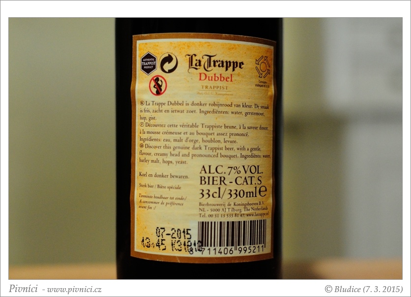 Výborný dubbel, skvěle se popíjí.Minimální trvanlivost: 31. července 2015